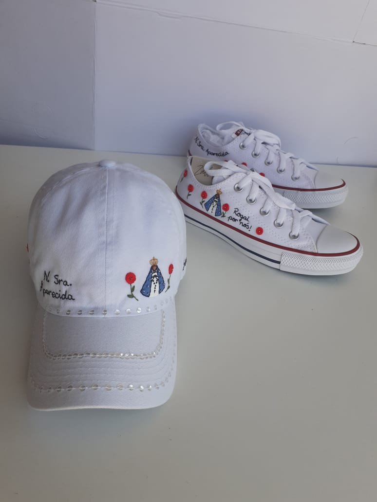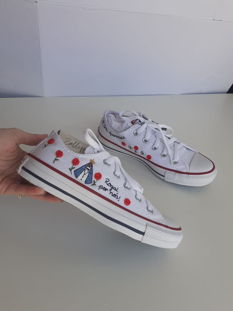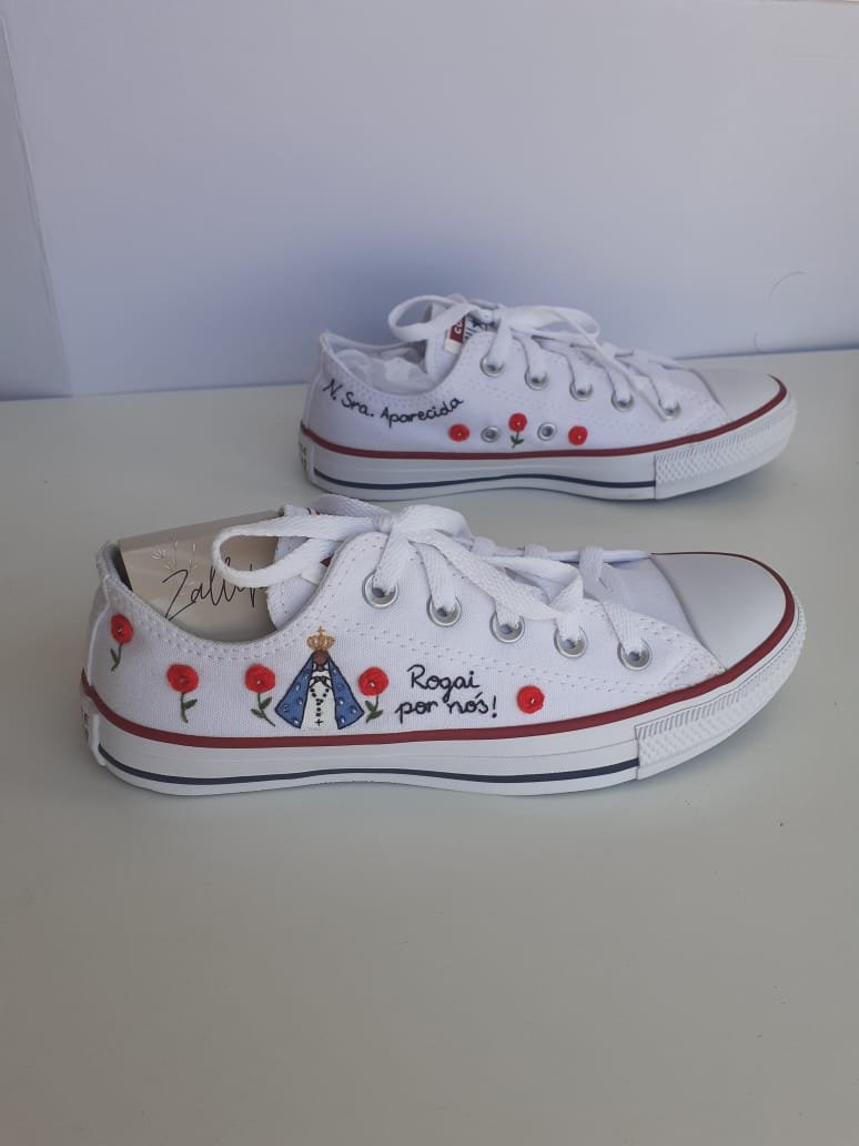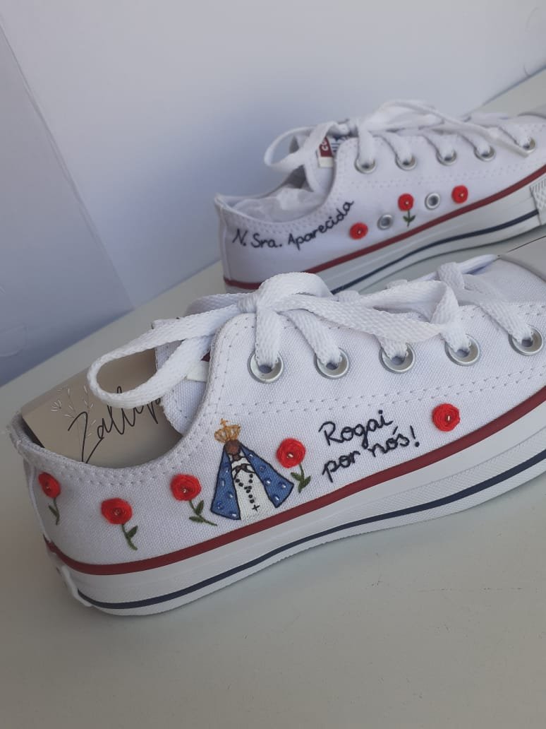 All Star todo bordado a mão com N. Sra. Aparecida e rosas. Bordado em linha com miçanguinhas. Símbolo de fé e devoção. Original. Cano baixo branco.