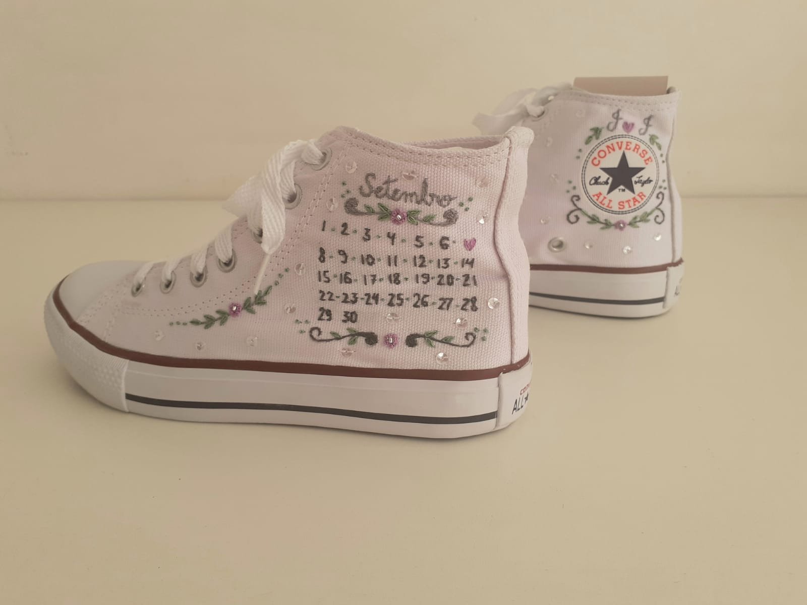 A noiva Jaqueline tinha uma ideia bem específica de bordado para o seu tênis: o calendário com a data da cerimônia e também as iniciais dela e do noivo. Então criamos essa arte linda e incluímos flores bem delicadinhas e arabescos. Tudo bordado a mão com linha, miçanguinhas e mini paetês. Utilizamos as cores da paleta do casamento e o resultado ficou do jeitinho que a sempre Jaqueline sonhou.
