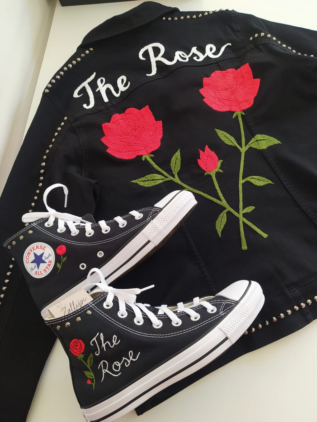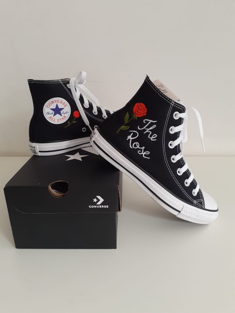 All star converse original bordado manualmente com rosas e escrito “The Rose” em linha. Cano alto preto.