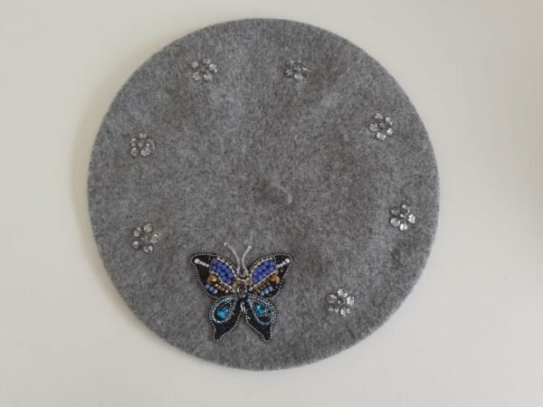 Descrição: Boina estilo francesa cinza com bordado de borboleta e flores, de pedraria .