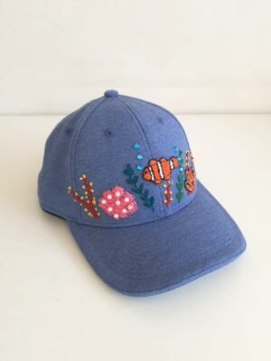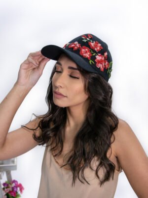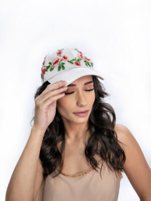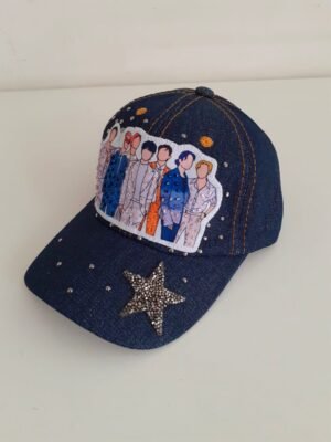 Boné marrom com bordado manual de pedraria dourada na frente. Também possui bordado de strass e vidrilhos contornando o boné.