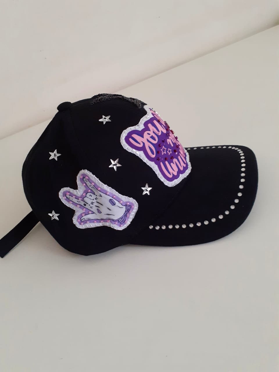 Boné preto personalizado com imagens do JK e bordados de linha com pedraria. Possui várias estrelas na frente e aplicação de cristais na aba.