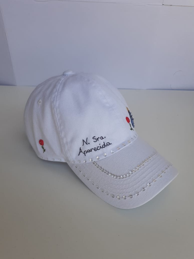 Boné branco com bordado manual de N. Sra. Aparecida, rosas e personalizado com seu nome. Bordado de linha com miçanguinhas e paetês na aba.