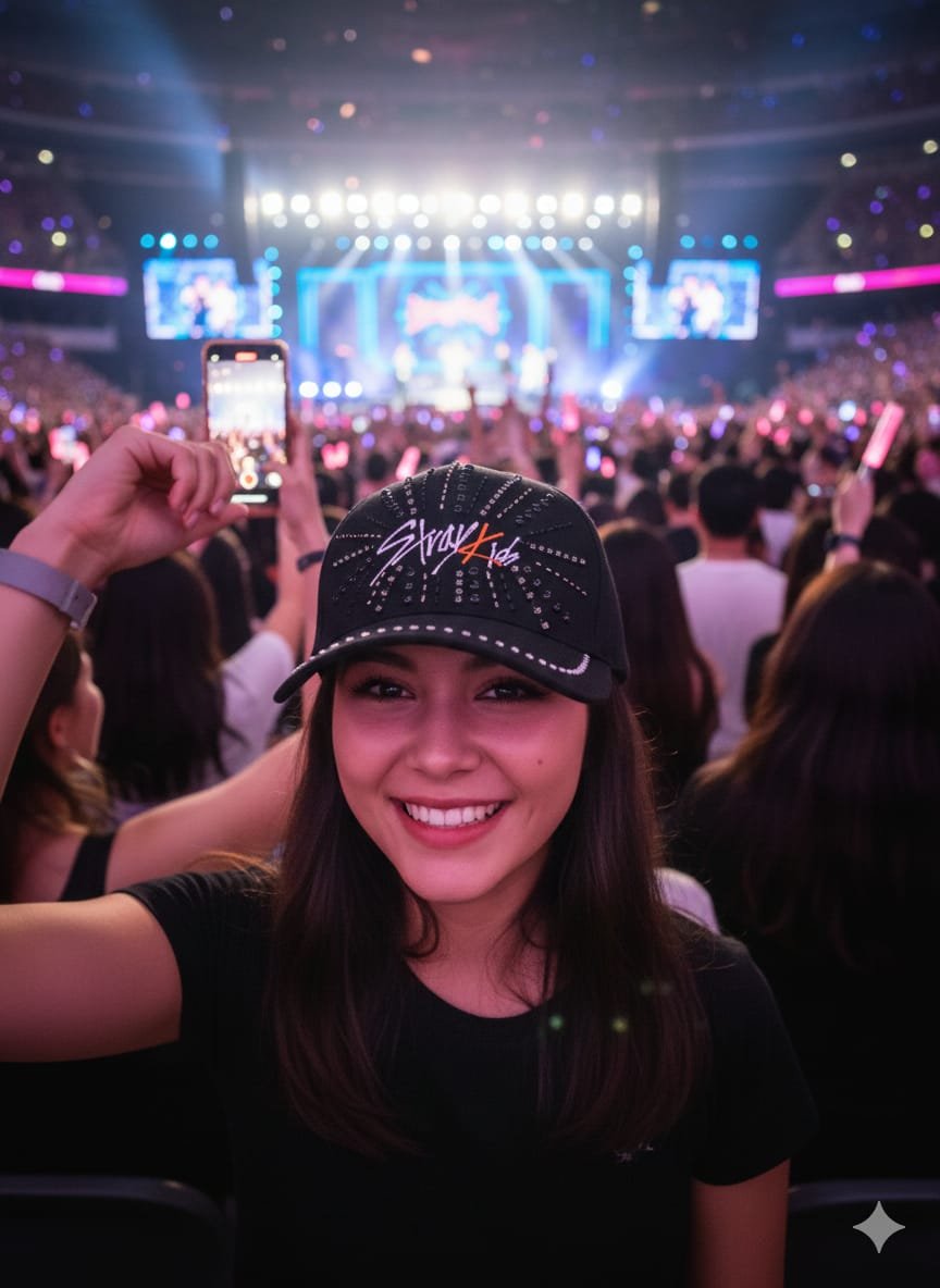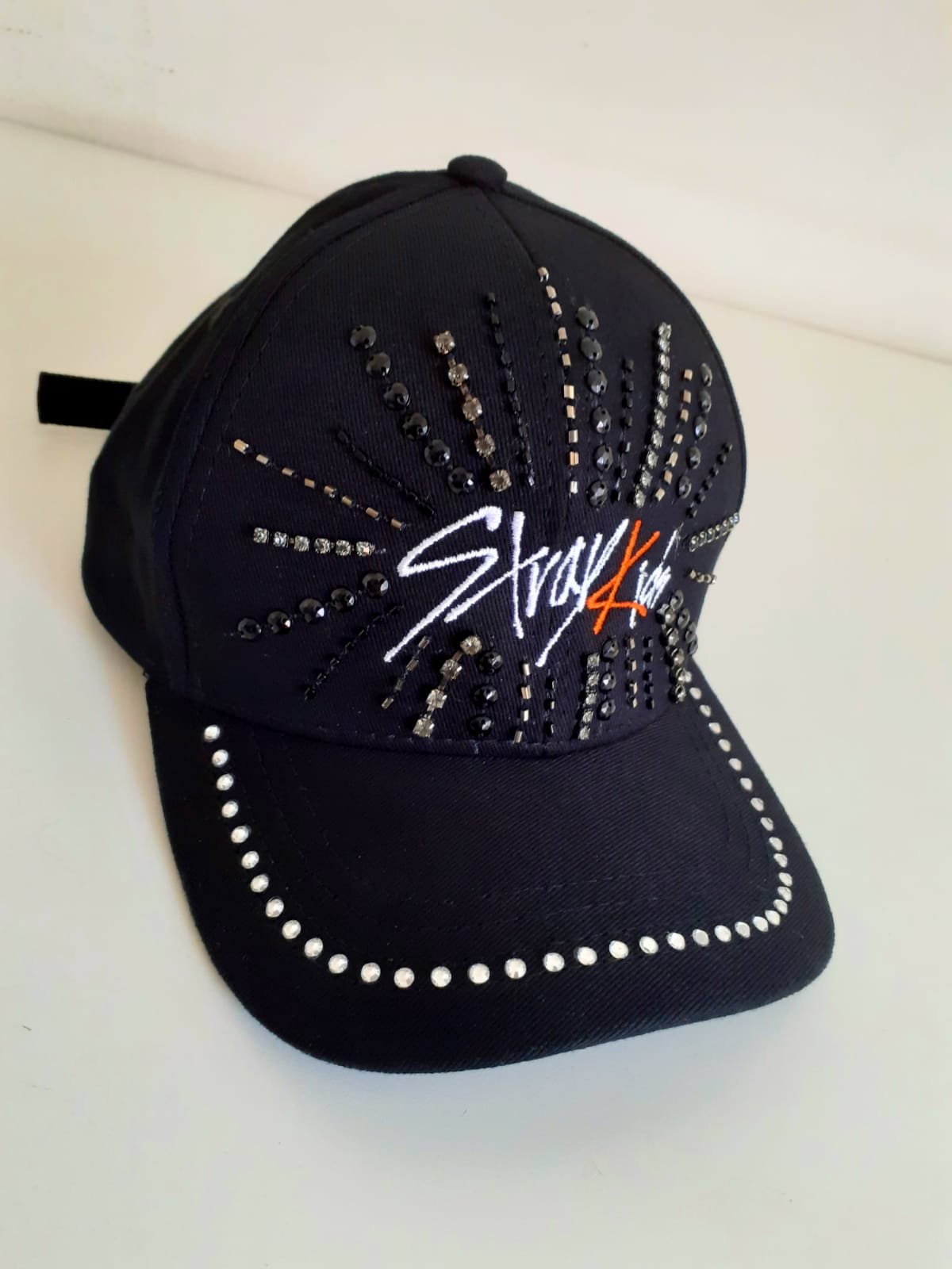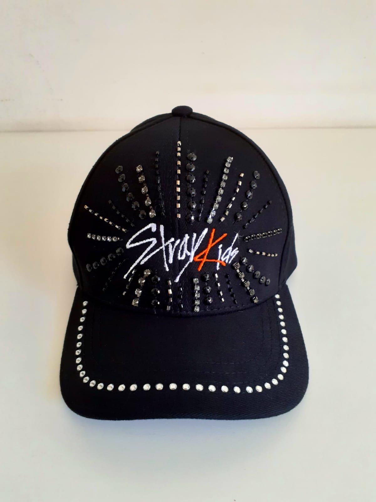 Boné preto com bordado “Stray Kids” na frente, com bordado manual de strass e vidrilhos, com cristais na aba. Possui regulagem atrás.