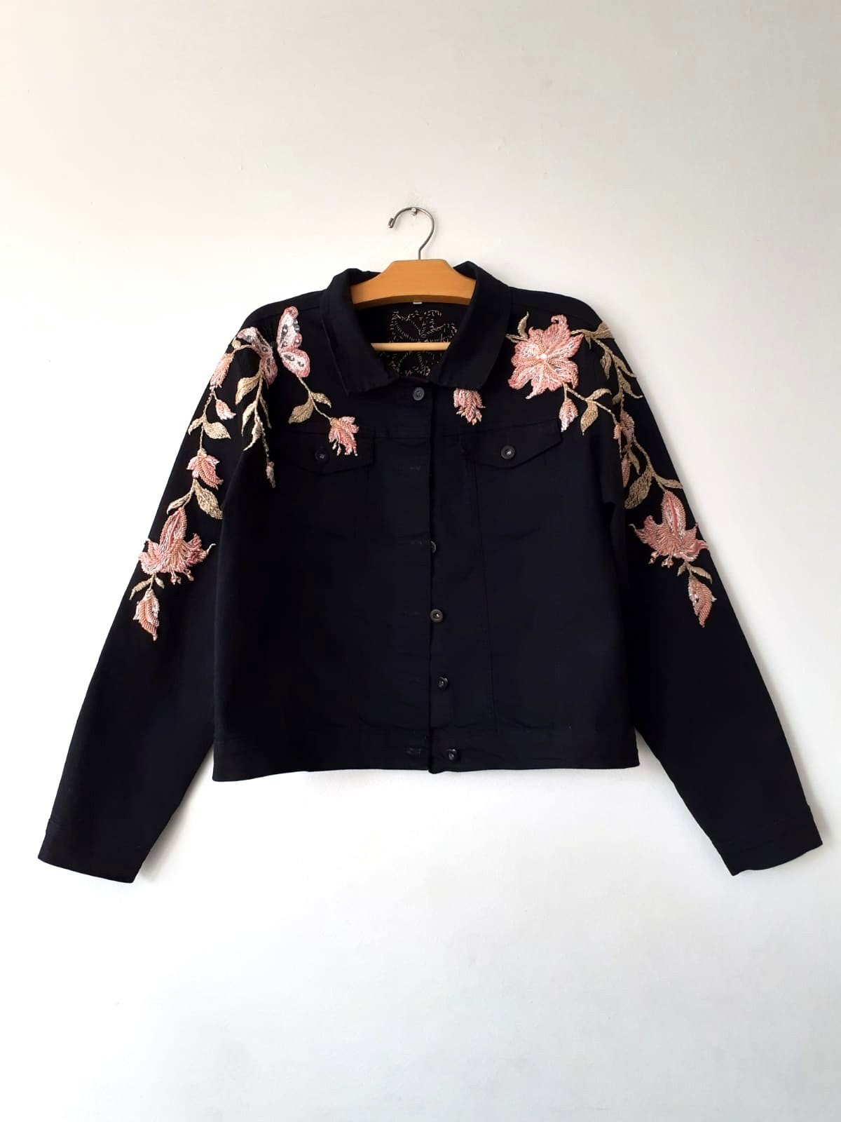 Descrição: Perfeita para looks glamorosos! Jaqueta em sarja com elastano. Bordados manuais com flores e borboletas. Mix de linhas rosa e dourado com pedraria.