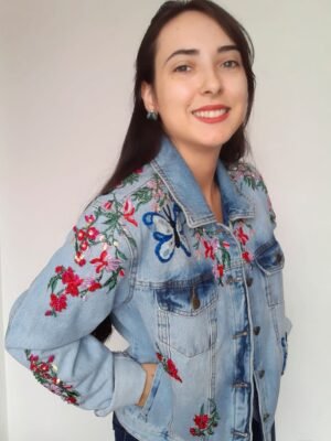 Descrição: Perfeita para looks glamorosos! Jaqueta jeans com bordado manual de pedraria colorida. Bordados na frente, ombros, costas, mangas e punhos. Possui bolsos frontais na altura do busto, recorte acima do busto, recortes na vertical, botões de metal e barra desfiada. Composição: 98% algodão e 2% elastano. Cor: jeans azul escuro.