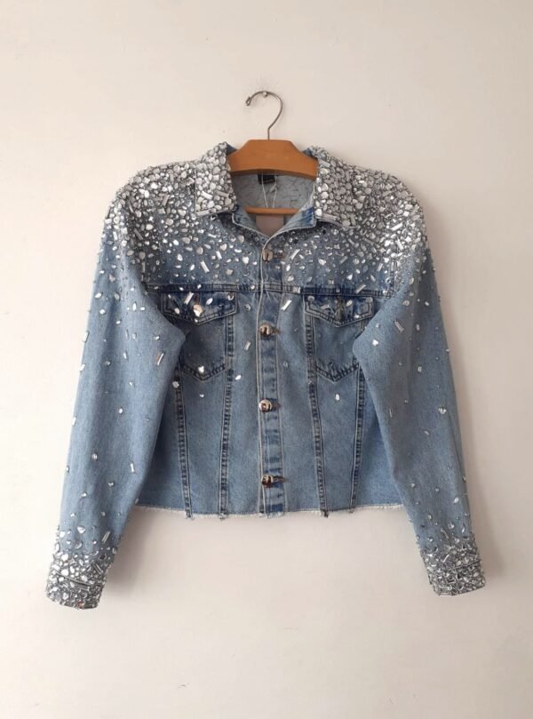 Descrição: Perfeita para looks glamorosos! Jaqueta jeans claro com bordado manual de pedrarias. Bordados na frente, ombros, costas, mangas e punhos. Possui bolsos frontais na altura do busto, recorte acima do busto, recortes na vertical, botões de metal e barra desfiada. Composição: 100% algodão. Cor: jeans azul claro.