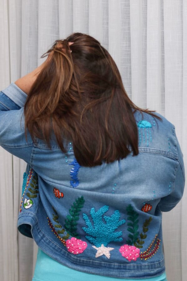 Jaqueta jeans possui algas, corais, conchas, estrelas-do-mar, peixes Nemo, tartaruga, água-viva, cavalo-marinho e caranguejo, todos bordados a mão com linhas coloridas. Também possui aplicações de pérolas e chatons. Bordado na frente e nas costas.
