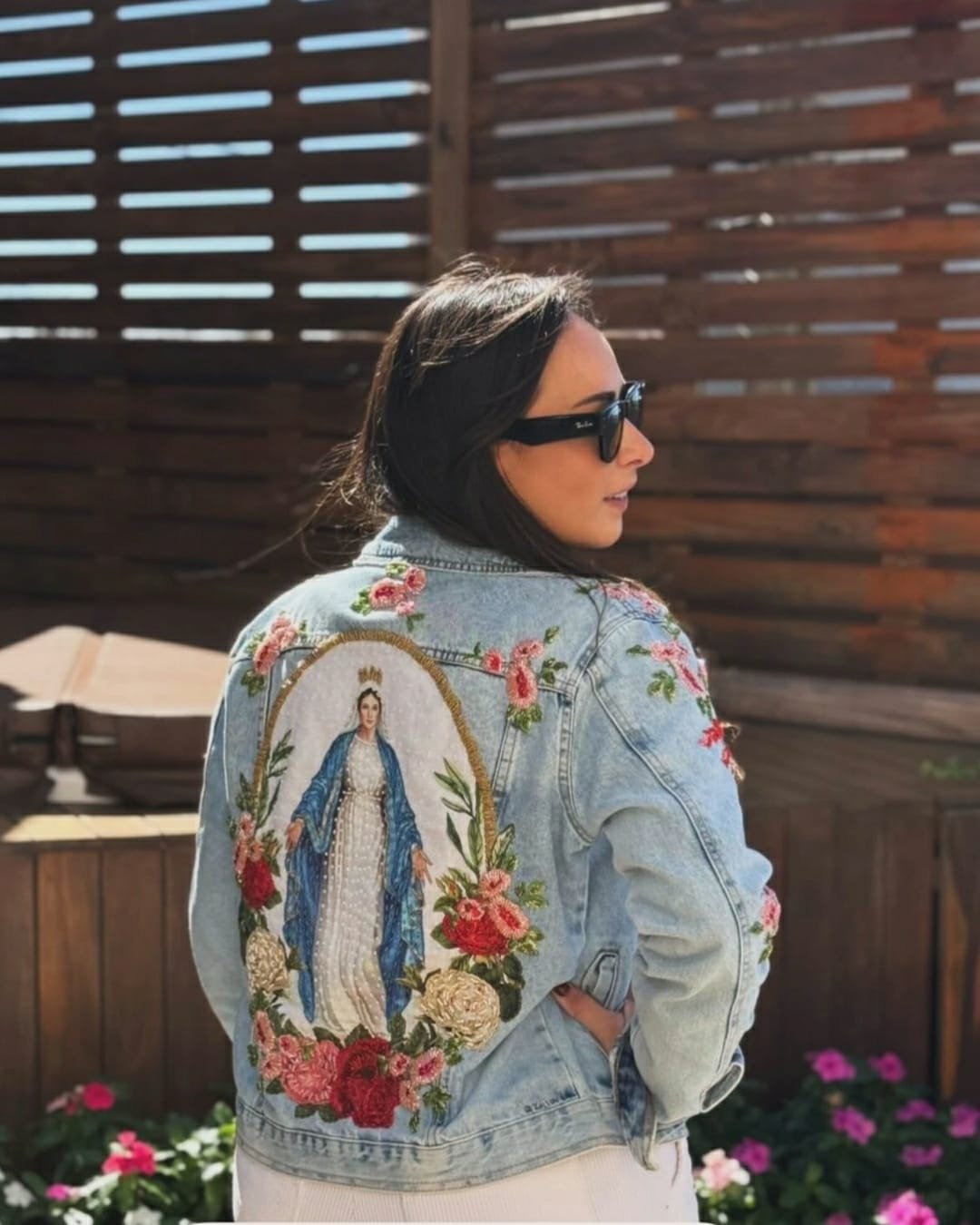 Descrição: Jaqueta jeans claro com bordado manual de linhas com pedrarias. Possui bordado de flores na frente, mangas e costas com a imagem de N.Sra. das Graças rebordada com linhas, flores e pedraria.
