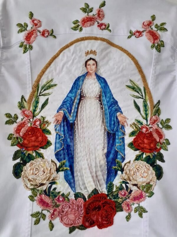Descrição: Jaqueta de brin com bordado manual de linhas com pedrarias. Possui bordado de flores na frente e costas com a imagem de N.Sra. das Graças rebordada com linhas, flores e pedraria.