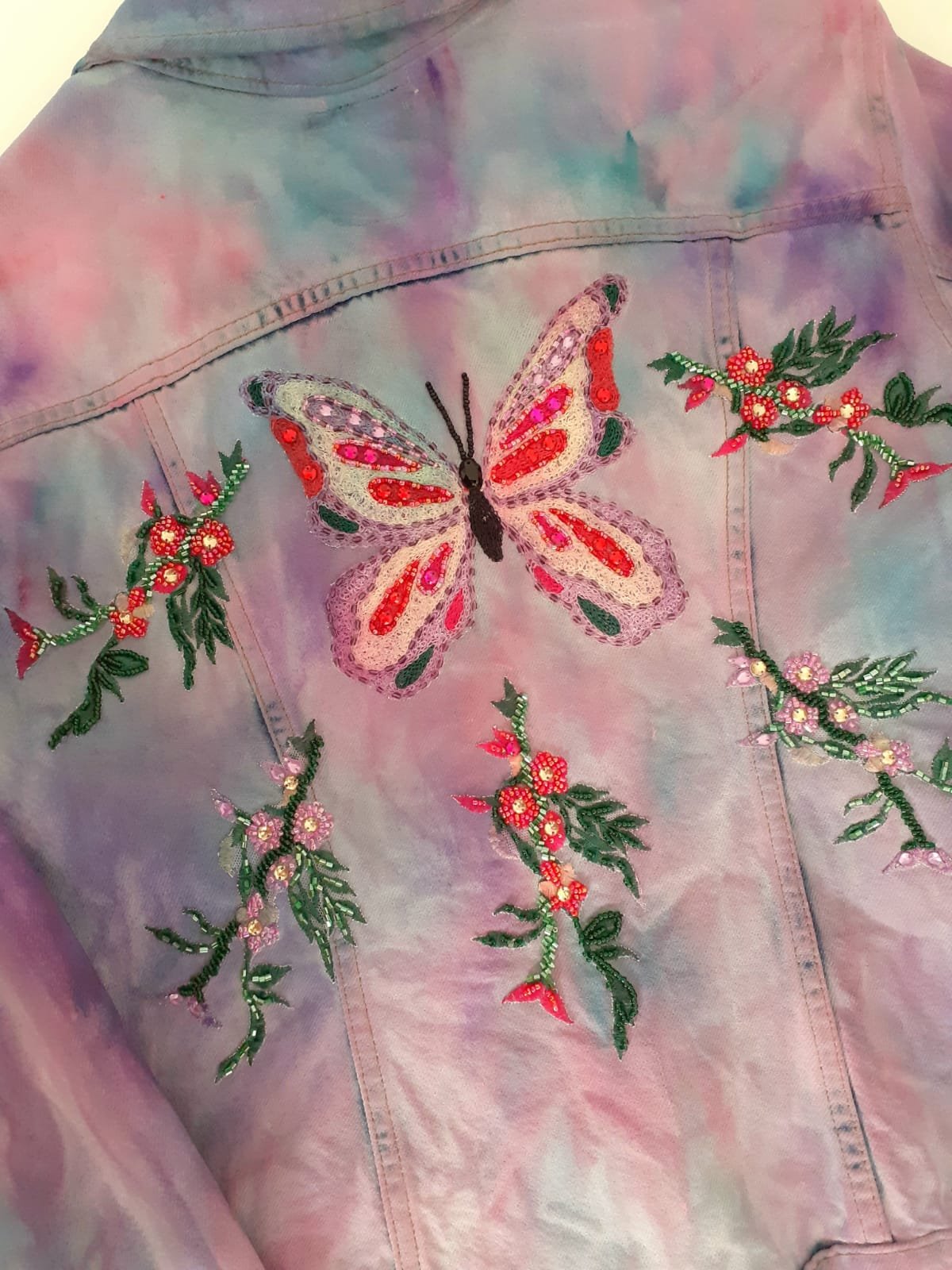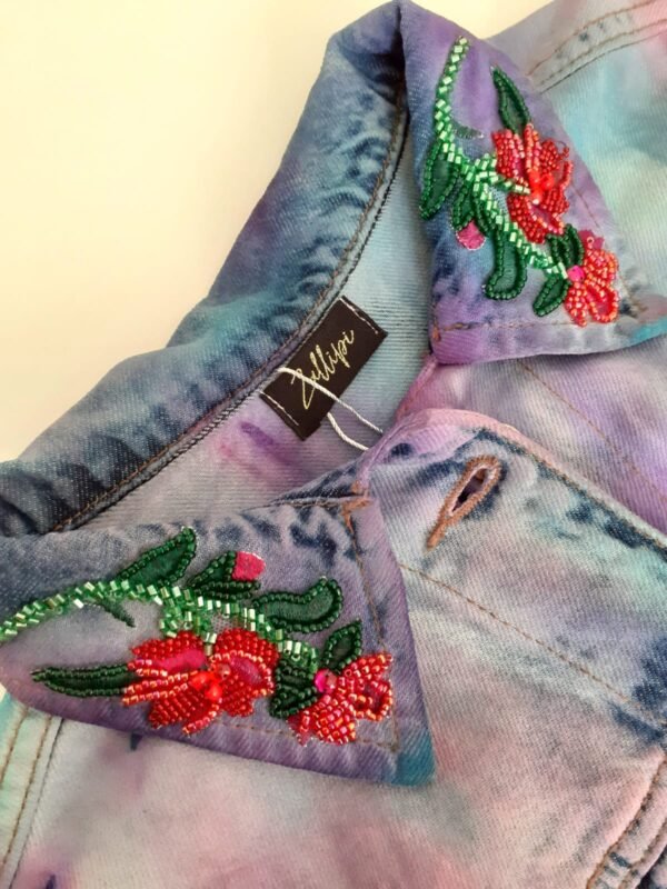 Descrição: Jaqueta jeans com pintura Tie-dye nas cores lilás, rosa, pink, roxo e turquesa. Possui bordado de borboleta e flores nas costas. Mistura de linhas com pedraria. Gola na frente bordada com flores delicadas.