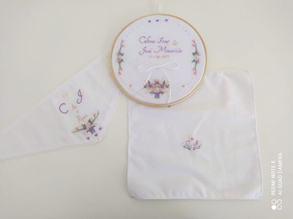 Noivinha, eternize o seu casamento com um Porta Alianças personalizado. Opção de bestidor 20cm e 22cm. Tecido 100% algodão. Para saber mais e consultar a agenda de encomendas: entre em contato através do whatsapp. Faremos o seu kit bordado com o maior carinho e capricho. Conte conosco!