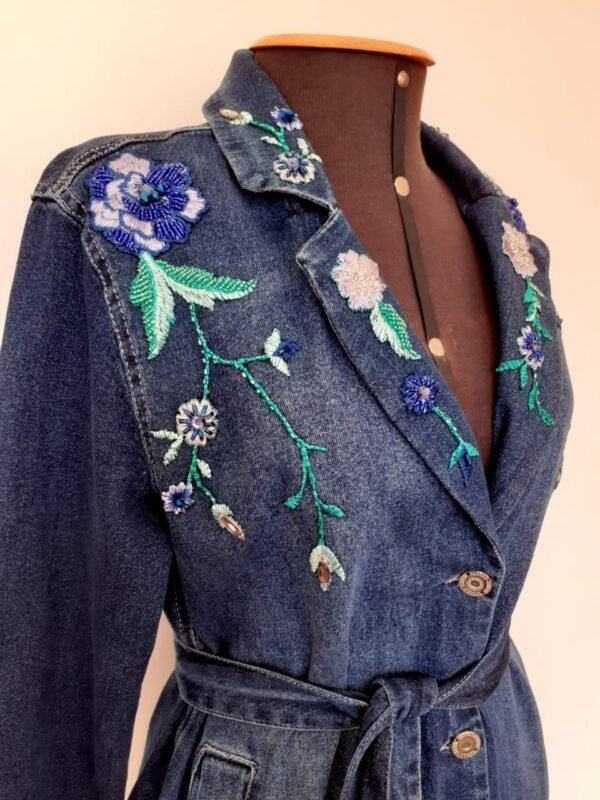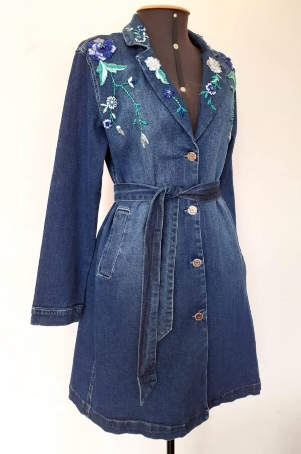 O sobretudo jeans bordado é uma peça clássica e elegante. Perfeito para os dias de outono e inverno.