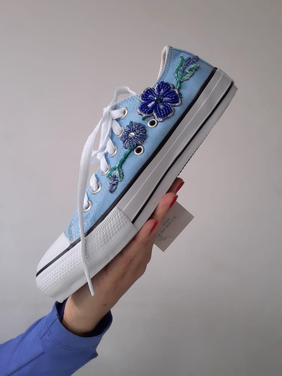 Tênis todo bordado a mão com flores de linha com pedraria. PRONTA-ENTREGA DA NUMERAÇÃO 35 E 37. Obs: Esse Tênis tem a forma grande, ou seja, a numeração 35 calça 36 e a numeração 37 calça 38..